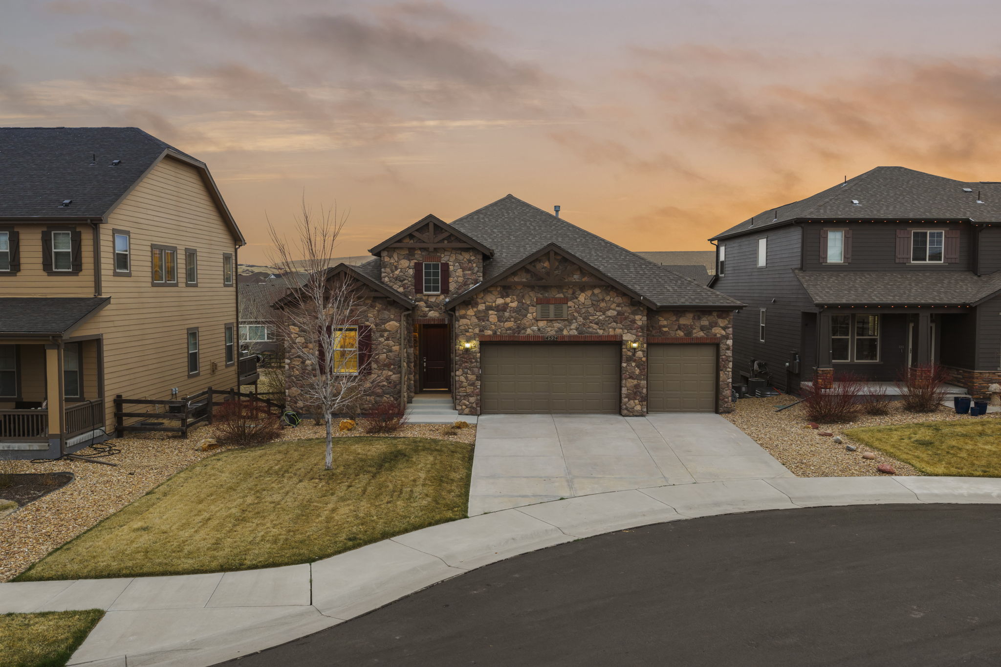 Meticulously maintained and truly turnkey, this exceptional 3 bedroom, 4 bathroom ranch-style home offers a fully finished walkout basement, main floor study, and rare true side-by-side 3-car garage, all ideally situated in a quiet cul-de-sac backing to dedicated open space. The elegant main level features hardwood floors, 8-foot doors, abundant natural light, and a beautifully appointed gourmet kitchen with large center island, quartz countertops, 42-inch Cascade white cabinetry, double convection ovens, Bosch induction cooktop with stainless steel hood, Frigid-Air French door refrigerator with freezer drawer, walk-in pantry, and spacious dining area. The inviting family room showcases 12-foot ceilings, expansive windows, and a gas fireplace. Step outside to the covered Colorado Room and enjoy peaceful open space and Reuter-Hess Incline views, with stairs leading to the professionally landscaped, fully fenced backyard. The private primary suite is a luxurious retreat with stunning views, a fully remodeled 5-piece bath with soaking tub, dual quartz vanities, seamless glass shower with custom tile, rain shower head and bench, and a generous 7x12 walk-in closet with California Closet organizers. A secondary main floor guest suite with adjacent full bath, private study with glass French doors, and mud/laundry room complete the main level. The finished walkout basement is ideal for entertaining with a spacious great room/game room, wet bar or mother-in-law kitchen with full-size stainless-steel refrigerator, quartz counters, Cascade white cabinets, and utility sink, plus walkout access to a covered patio and large concrete pad. An additional guest suite with walk-in closet and adjacent 3/4 bath offers flexibility, while the expansive storage/utility room provides future finish potential. Just steps from the East/West Trail, Reuter-Hess Reservoir, recreation, and the Challenge Incline, with easy access to I-25, downtown Parker, DTC, and DIA.
