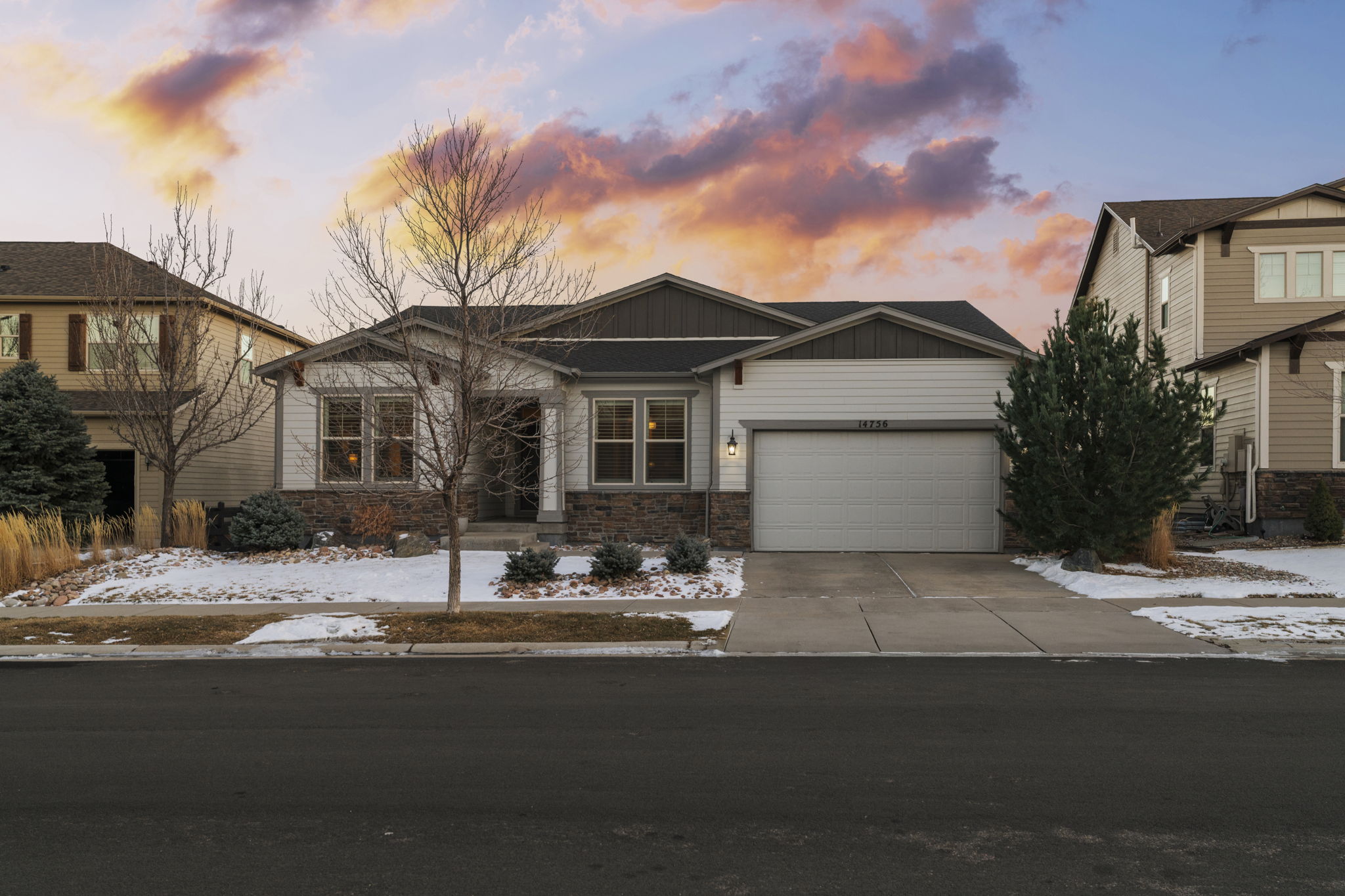 This incredible, meticulously maintained 4 bedroom, 5 bath, 4,786 sq ft ranch-style home backing to dedicated open space is truly breathtaking and priced to sell. A new Class 4 impact-resistant shingle roof installed in 2024 adds exceptional value and peace of mind. The main floor showcases hardwood floors, plantation shutters, hand-troweled walls, and 8’ doors throughout. The gourmet kitchen features quartz countertops, 42” staggered Cascade White cabinets with crown molding, a large walk-in pantry, double ovens, a 4-burner gas cooktop, and a modern white French-door refrigerator with freezer drawer, plus an elegant butler’s pantry and breakfast nook. The spacious family room is filled with natural light from oversized windows and southern exposure and is complemented by a formal dining room or study. The private owner’s suite offers a tray ceiling and a luxurious 5-piece bath with dual vanities, custom backsplash, a glass-enclosed shower with bench, and a large walk-in closet. Two additional main-floor guest suites each feature their own full bath, along with a main-floor laundry room and powder bath. The 3-car tandem garage includes finished and painted walls. The 2,393 sq ft fully finished basement is ideal for entertaining, offering a massive recreation room plumbed for a wet bar, open study area, an additional guest suite with adjacent full bath, and over 600 sq ft across three separate storage and utility rooms. The rear exterior features a private covered Colorado Room and a professionally landscaped yard backing to breathtaking open space and trail views—some of the best in Parker. Just one block to the Heirloom community pool and clubhouse and minutes to Rueter-Hess Reservoir, I-25, downtown Parker and Castle Rock, DTC, and DIA. An exceptional home in an unbeatable setting.